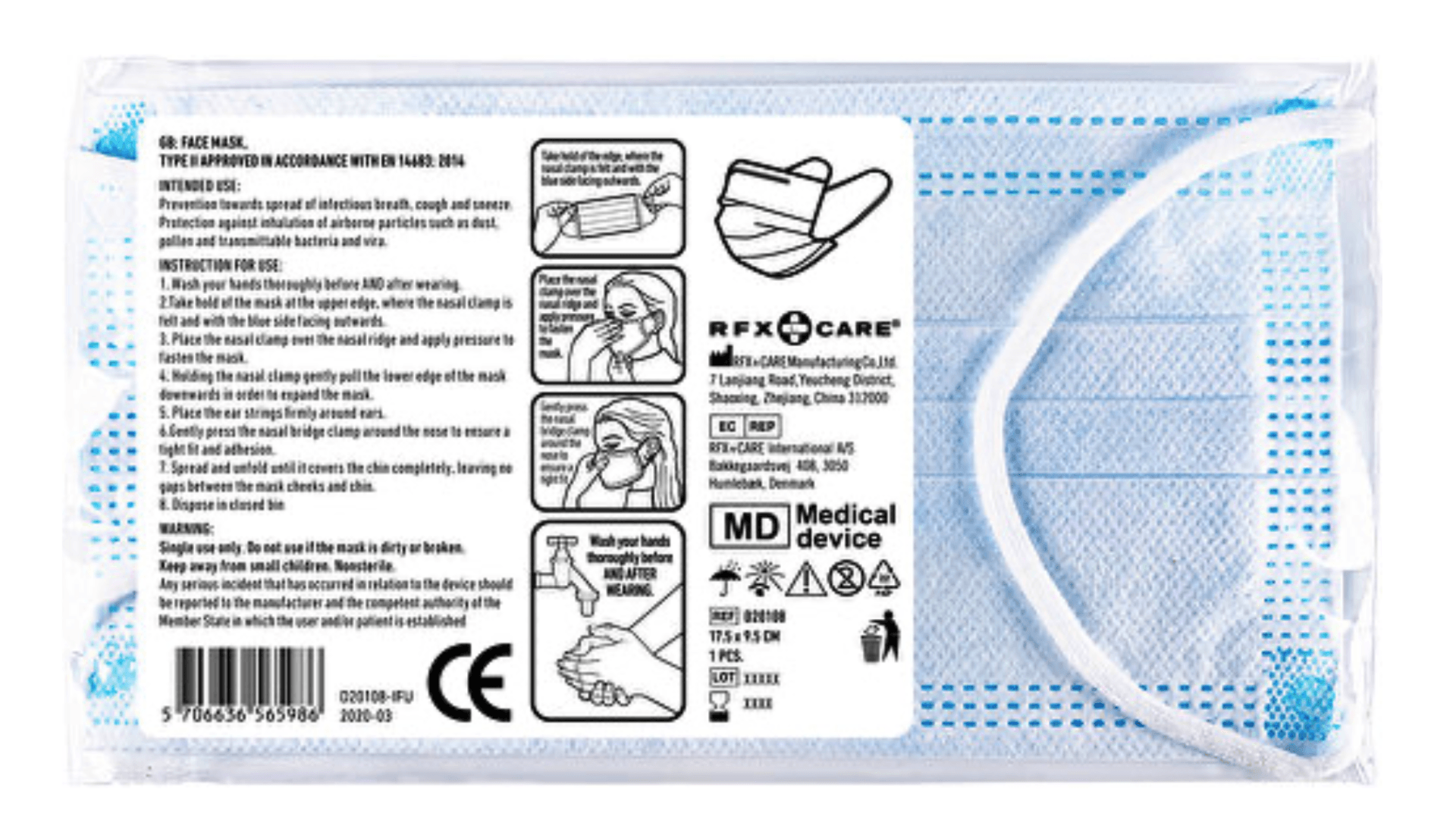 >> Maske mit Standardetikett auf der Rückseite: Bakterienfiltereffekt (BFE), getestet gemäß Tests und Anforderungen der EU-Medizinprodukterichtlinie 93/42 / EWG, Anhang VII, Klasse 1 Typ II, genehmigt gemäß EN 14683: 2014.