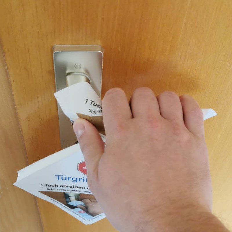 >> Der Türgriffschutz enthält 50 griffstarke Soft Airlaid-Tücher, die mit einer Kordel zusammengehalten werden.